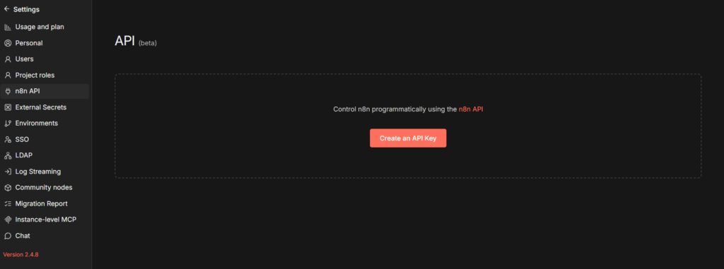 To create your n8n API Key: In n8n, go to Settings > API > Create API Key (Copy this and keep it safe)