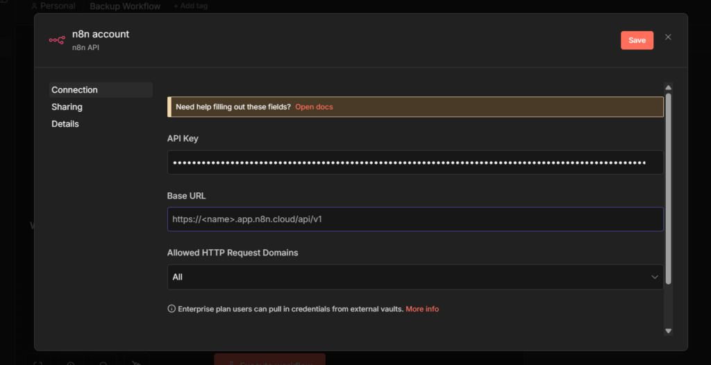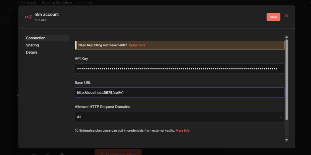 In the base URL add your name or else if your using self-hosted locally then add this http://localhost:5678/api/v1 – If it’s self-hosted on a VPS then it should be like this http://YOUR_VPS_IP:5678/api/v1