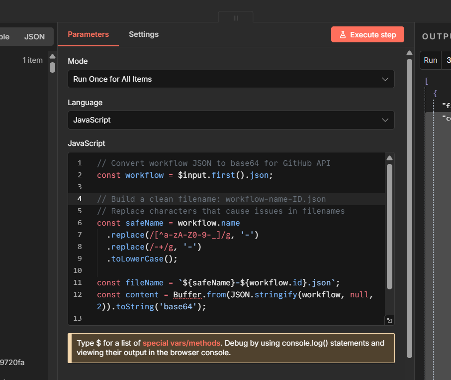 Add a Code node. You need to convert the workflow JSON to base64, because the GitHub API requires base-64 encoded content when creating or updating files.