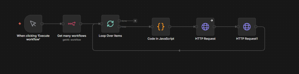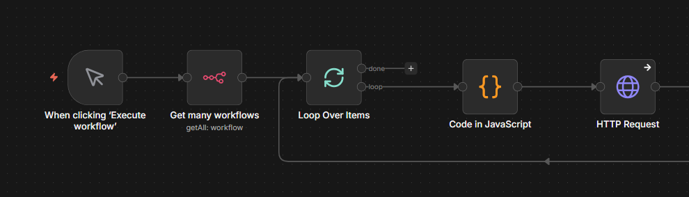 Add a Loop Over Items node. This processes one workflow at a time, which matters because you’ll be making individual GitHub API calls per workflow (If you’re new to loops in n8n, here’s how the loop node works)