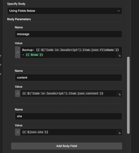 The sha field handles both cases automatically. When the file already exists, the previous GET request returns the sha and it gets passed here. When the file is new, the GET returns nothing and $json.sha is simply empty – which is exactly what GitHub expects for file creation. No IF node needed eventually, no extra complexity.